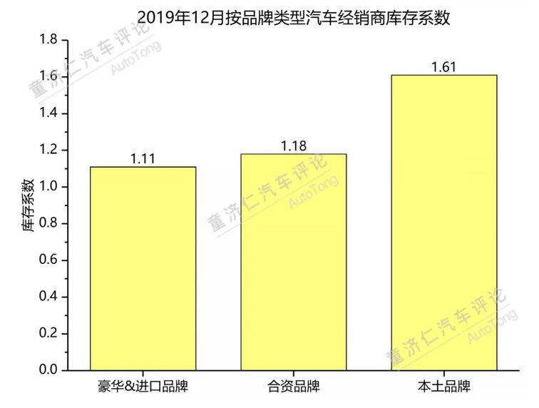 在经销商端,2019年车市的一大关键词是“去库存”,至2019年12月,车市库存降至全年*低的1.33。分类来看,豪华/进口品牌、合资品牌、本土品牌在去年12月后的库存系数分别为1.11、1.18、1.61,其中库存*高的车企为1.75。也就是说,按照正常销售节奏,经销商普遍库存大约可以维持不到2个月,部分库存较低的日系车企可能在1个月内。